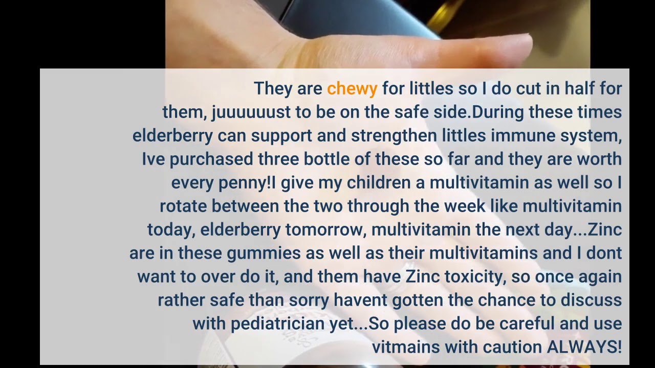 They are chewy for littles so I do cut in half for them, juuuuuust to be on the safe side.During these times elderberry can support and strengthen littles immune system, Ive purchased three bottle of these so far and they are worth every penny!I give my children a multivitamin as well so I rotate between the two through the week like multivitamin today, elderberry tomorrow, multivitamin the next day…Zinc are in these gummies as well as their multivitamins and I dont want to over do it, and them have Zinc toxicity, so once again rather safe than sorry havent gotten the chance to discuss with pediatrician yet…So please do be careful and use vitmains with caution ALWAYS!
