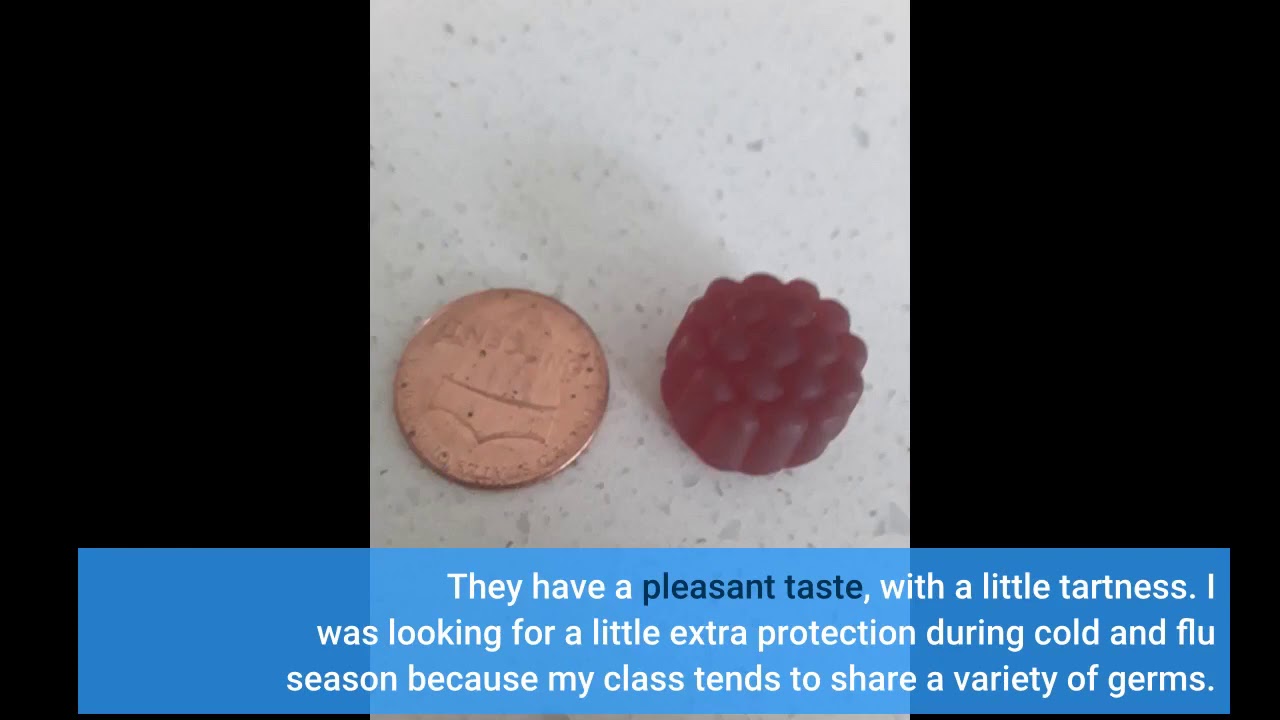 My kids love these during the flu and cold season. They have a definite raspberry taste. The dose is 2 gummies/day for adults. That provides 100% vit C, 68% zinc and 100mg elderberry.They are verrrrry sweet.