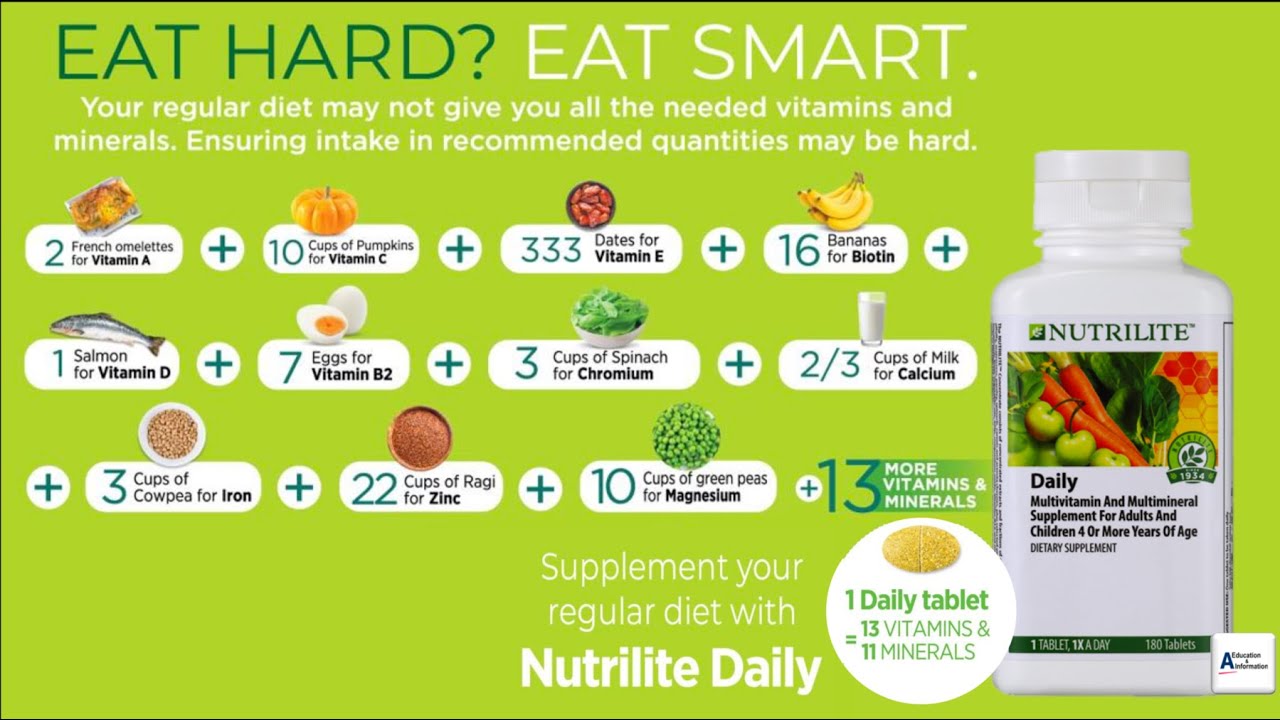 Eat Hard Eat Smart. Nutrilite Daily is a great option if you’re looking for a multivitamin multimineral to help fill your dietary gaps. It’s packed with essential vitamins and minerals, plus plant concentrates that deliver a wide variety of phytonutrients, plant-based nutrients that deliver a variety of health benefits. Watch the video to learn more.