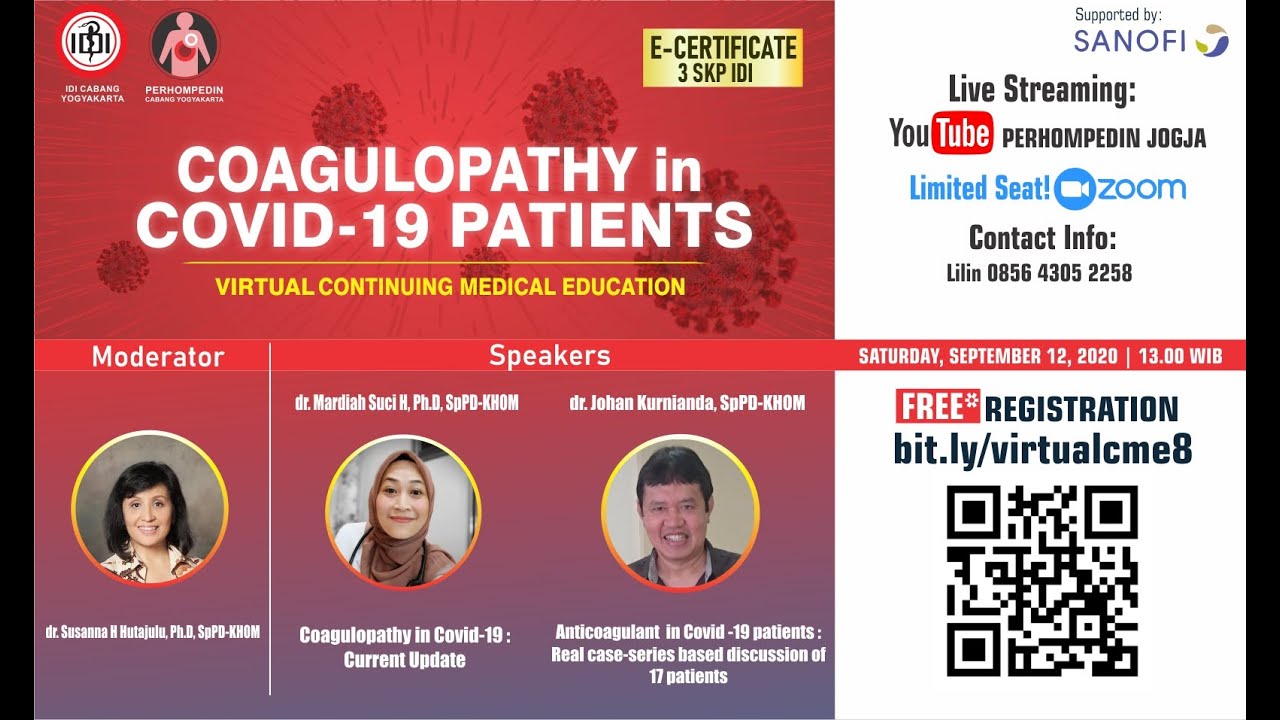 Virtual Continuing Medical Education(CME) ini diadakan oleh PERHOMPEDIN JOGJA melalui ZOOM & Live Streaming YOUTUBE. Acara ini gratis! diperuntukan untuk Mahasiswa Kedokteran, Dokter Umum, Dokter Penyakit Dalam & Ahli Hematologi-Onkologi Medik.