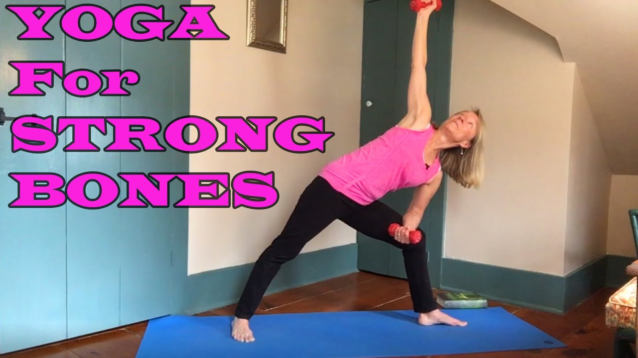 Light weights adds resistance to a bone strengthening yoga sequence.