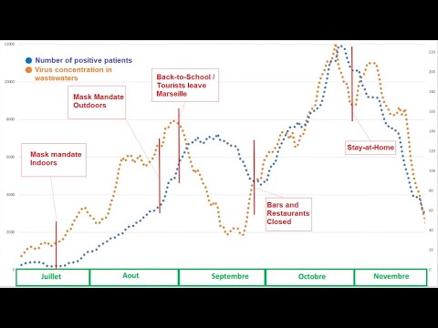 Translation of a slide from Pr. Raoult’s weekly video, using viral concentration in wastewater analysis to show that the peak of infection in Marseille preceded the latest lockdown measures (that actually caused a small infection rebound).