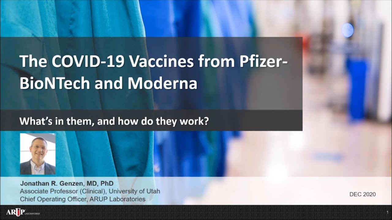 Learn about the composition and delivery mechanism of the two newly available COVID-19 vaccinations from Pfizer-BioNTech and Moderna with Dr. Jonathan Genzen, COO of ARUP Laboratories and an Associate Professor at the Universtity of Utah School of Medicine.