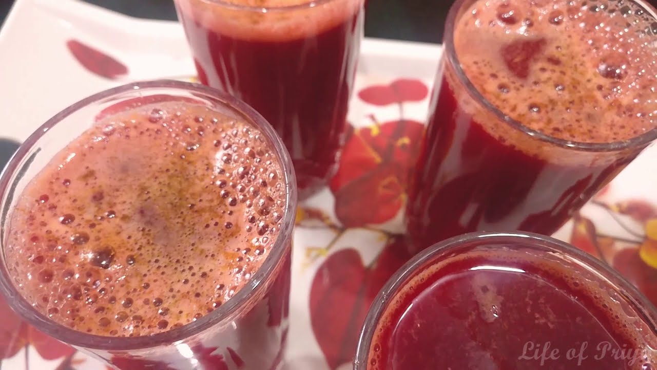ऊपर की सारी सामग्री को मिक्सर के जार में डालकर अच्छे से पीस लें, फिर उसे एक बड़ी सी छन्नी में छान ले, और फिर उस जूस को ग्लास में डाले ,फिर उसमें नींबू काला नमक चाट मसाला के साथ उसे शर्व करे