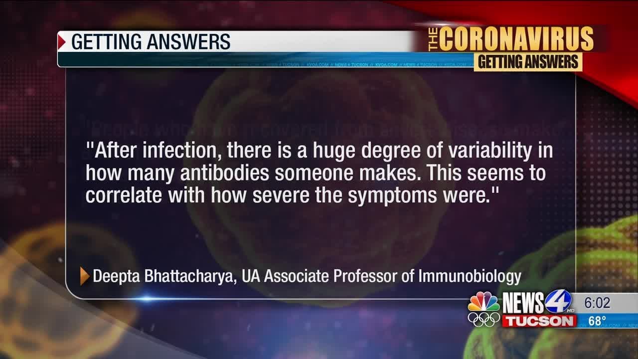 some viewers were asking us what provides more immunity to the coronavirus recovering from covid19 or the vaccine news 4 tucson’s priscilla casper is getting answers the arizona department of health services reports monday more than 561 thousand people in the state have tested positive for kova 19 since last january and so far more than 90 thousand people in arizona have been vaccinated some viewers wanted to know does immunity after getting covet 19 last longer than protection from a covid vaccine deeptap acharya an associate professor of immunobiology at the university of arizona said that since the vaccines have just begun to be administered they don’t really know the answer to this question at this time what he can say though is quote after infection there is a huge degree of variability in how many antibodies someone makes this seems to correlate with how severe the symptoms were people who have recovered from severe disease make a lot of antibodies and it will likely take a long time for those to decline to a point where you are no longer protected he says that people who recovered from mild disease make fewer antibodies and people that were asymptomatic make even less in regards to the vaccines he says everything seems more uniform that quote based on early data from moderna i would be very surprised at the antibodies after two shots dropped below the protective threshold in less than a year i expect the pfizer vaccine will behave similarly meanwhile the centers for disease control reports current evidence suggests that reinfection with the coronavirus is uncommon in the 90 days after the initial infection however the cdc still needs more data regarding vaccine immunity to see how well it works if you have a question about the coronavirus email getting answers at kvoa.com we’ve got you covered priscilla casper news 4 tucson