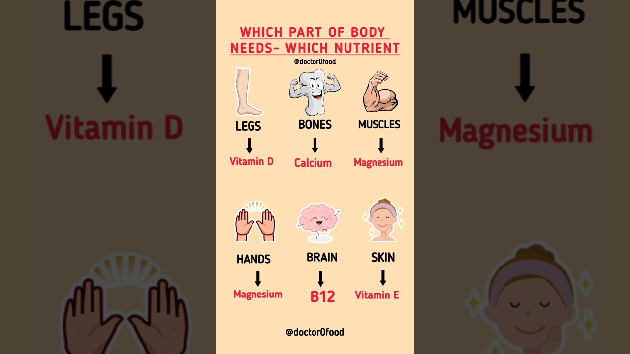 body nutrients, vitamins and minerals, vitamin D for legs, calcium for bones, magnesium for muscles, magnesium for hands, vitamin B12 for brain, vitamin E for skin, nutrients for body parts, essential vitamins, best foods for bones, best foods for muscles, natural sources of vitamins, how to get vitamin D, importance of calcium, benefits of magnesium, brain vitamins, healthy skin vitamins, diet and nutrition, health and wellness, fitness and diet, nutrient deficiency, nutrition education, dietitian tips, health awareness, nutritional balance, body care through nutrition