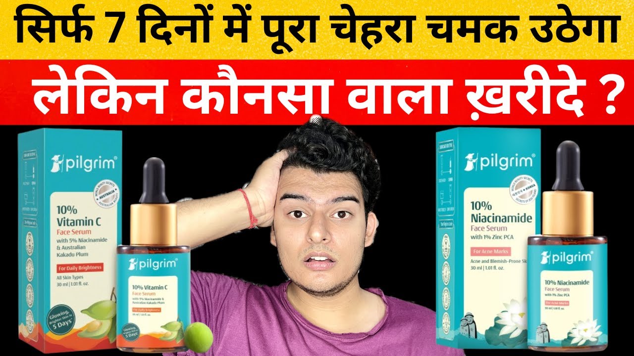 स्किन के ऊपर अगर काफी सारे पिंपल्स के मार्क्स हैं, काफी ज्यादा डलनेस है, आप चाहते हैं एक ब्राइटनिंग स्किन हो आपकी और आपके जो डार्क स्पॉट्स हैं वो भी लाइटन अप हो जाए तो फिर आप सर्च करते हैं Google पे या फिर YouTube पे तो आपके सामने दो इंगडिएंट्स आते हैं। एक है विटामिन सी दूसरा है नाइससेसिनोमाइट। विटामिन सी के रिव्यु में भी लोग कह रहे हैं कि साहब ये आपकी स्किन को ब्राइटन अप करता है और आपके डार्क स्पॉट्स को हटाएगा। नाइससेसमाइट के रिव्यु में भी लोग कह रहे हैं कि आपके डार्क स्पॉट्स को हटाएगा और आपकी स्किन को लाइट करेगा। लेकिन अब आप हो गए हैं कंफ्यूज्ड की भाई मैं विटामिन सी लूं या मैं नाइससेसमाइड वाला सीरम लूं। तो शायद आप यही सर्च कर रहे हैं YouTube पे और आपको आज हमारी वीडियो मिल गई है। अगर ऐसा ही हुआ है तो कमेंट सेक्शन में मुझे बताना। तो दोस्तों आज की वीडियो में आप लोगों को बताऊंगा कि आपको नासेसमाइट बेस सीरम लेना चाहिए या विटामिन सी बेस्ड सीरम लेना चाहिए। आज की वीडियो में मैं आप लोगों के सामने कंपैरिजन करने वाला हूं मेरे फेवरेट ब्रांड के दो सीरम्स को जो कि है पिलग्रिम का नयासनोमाइट सीरम और एक है पिल्ग्रिम का विटामिन सी सीरम। दोनों को चूज़ करने के पीछे सबसे बड़ा रीज़न ये है कि दोनों के अंदर जो विटामिन सी एंड नाइससेसमाइड का जो फार्मूला है वो बहुत ज्यादा बेटर है बाकी ब्रांड्स के कंपैरिजन में। जैसे अगर मैं बात करूं पिलगिम के विटामिन सी सीरम की तो उसके अंदर आपको जो विटामिन सी देखने को मिलता है वो थ्री ओ एथाइल एस्कोर्डिक की फॉर्म में देखने को मिलता है। जो कि विटामिन सी का सबसे ज्यादा स्टेबल फॉर्म होता है। स्टेबल होने की वजह से आपकी स्किन के ऊपर वो जल्दी से ऑक्सीडाइज नहीं होता। जल्दी से ऑक्सीडाइज नहीं होता तो स्किन में पेनिट्रेशन अच्छा होता है। पेनिट्रेशन अच्छा होता है तो रिजल्ट्स अच्छे मिलते हैं। नाइससेसमाइड की बात करूं तो नाइससेसमाइड सीरम में आपको जो है दोस्तों वो सेलेसिलिक एसिड एंड ग्लाइकोलिक एसिड भी देखने को मिलता है। साथ-साथ वाइट लोटस भी देखने को मिलता है। उस सीरम की खासियत ये है कि नासेमाइड होने के बावजूद भी स्किन को परर्ज नहीं करता। आपके डार्क स्पॉट्स को भी लाइटन अप करता है। ऑयली स्किन को भी कंट्रोल करता है और आपकी स्किन के ऊपर पिंपल्स, वाइट हेड्स, ब्लैक हेड्स ये सभी भी है तो उन्हें भी कंट्रोल करता है। यानी कि एक थ्री इन वन फार्मूला है। सेम गोस विथ विटामिन सी। विटामिन सी भी काफी ज्यादा अच्छा है बाकी ब्रांड्स के कंपैरिजन में। इसीलिए मैं इन दोनों ब्रांड्स को चूज़ कर रहा हूं। वीडियो के स्टार्टिंग में ये क्लियर कर देता हूं कि किसी भी ब्रांड ने मुझे ₹1 भी नहीं दिया है। इस वीडियो के कमेंट सेक्शन में भी आ