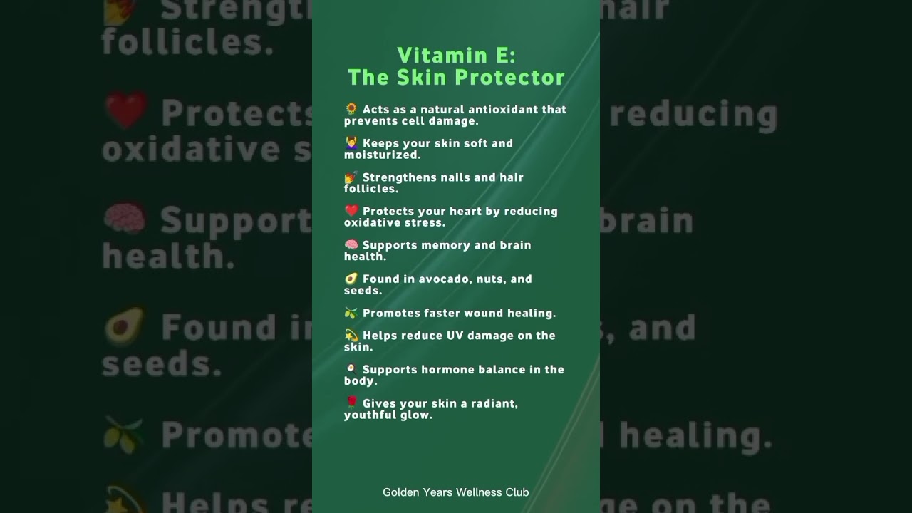 #VitaminE #SkinHealth #HealthyAfter40 #GoldenYearsWellnessClub #NaturalBeauty #GlowingSkin #HealthyLifestyle #Antioxidants #WellnessJourney #YouthfulSkin #HairAndNailCare #InnerBeauty #HealthyAging #RadiantSkin #BeautyFromWithin