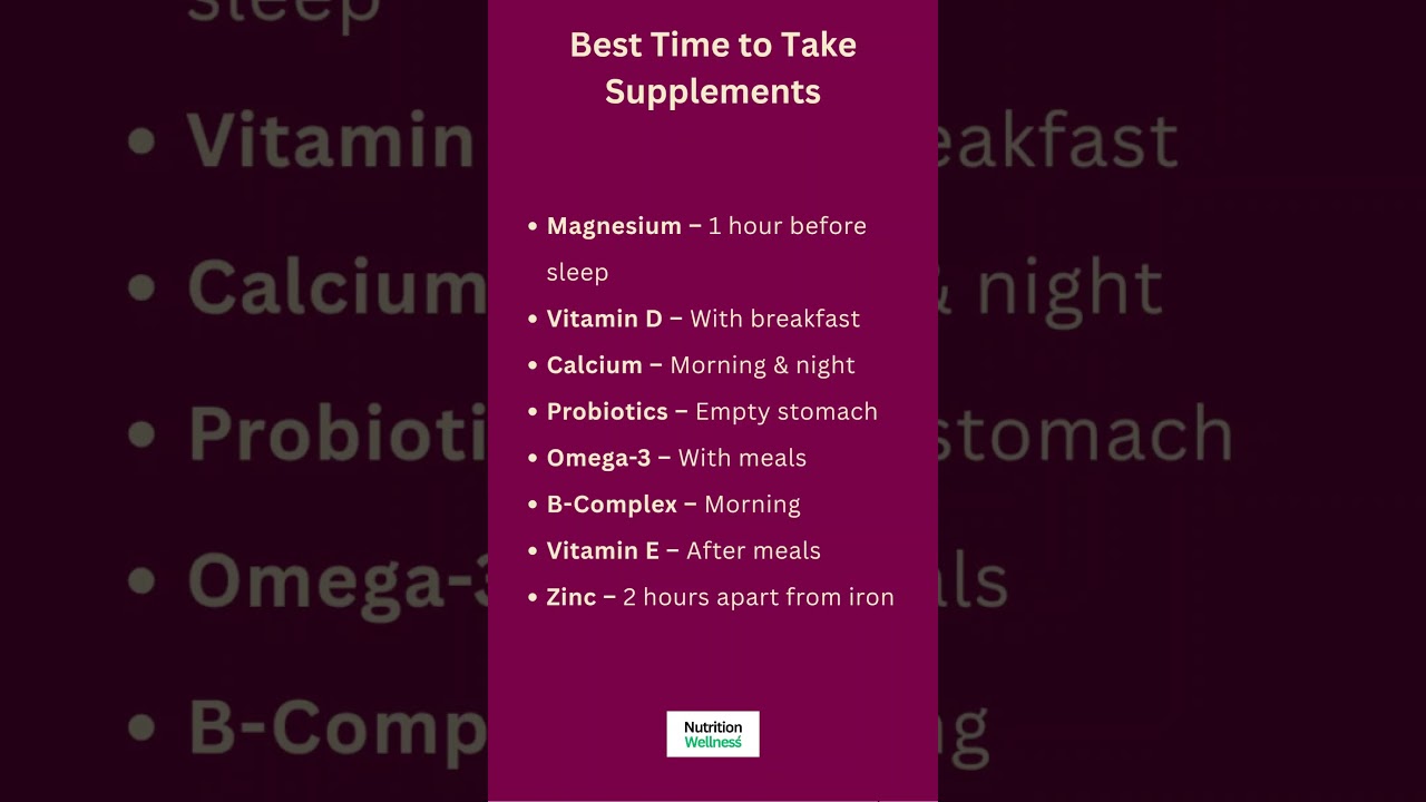 best time to take supplements, supplement timing, when to take magnesium, when to take vitamin d, when to take probiotics, when to take omega-3, when to take b-complex, maximize supplement absorption, supplement schedule, vitamin guide, wellness routine, nutrition tips, health hacks