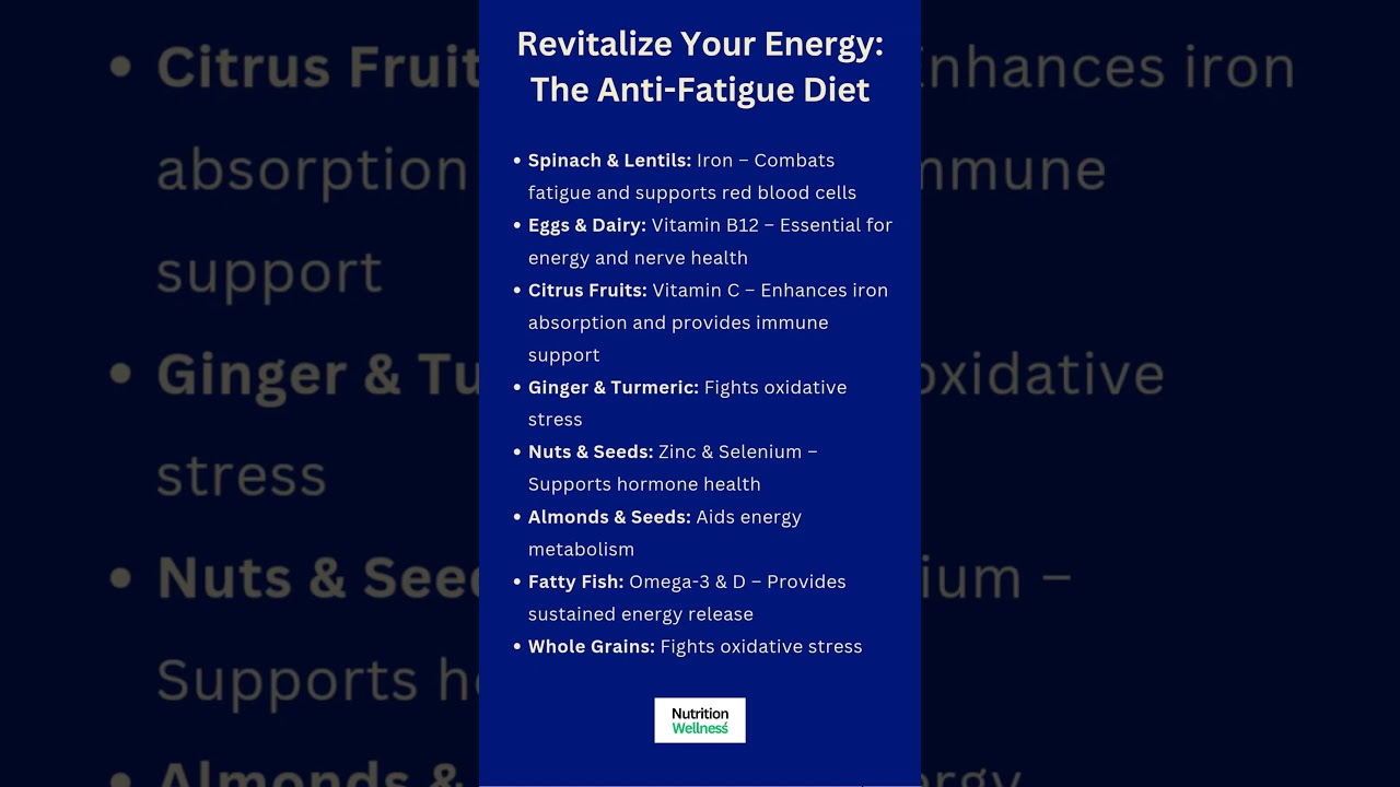 anti-fatigue diet, revitalize your energy, combat tiredness, foods for energy, fight fatigue, spinach, lentils, iron, vitamin B12, eggs, citrus fruits, vitamin C, ginger, turmeric, nuts, seeds, fatty fish, omega-3, whole grains, energy metabolism, immune support, nutrition tips, wellness