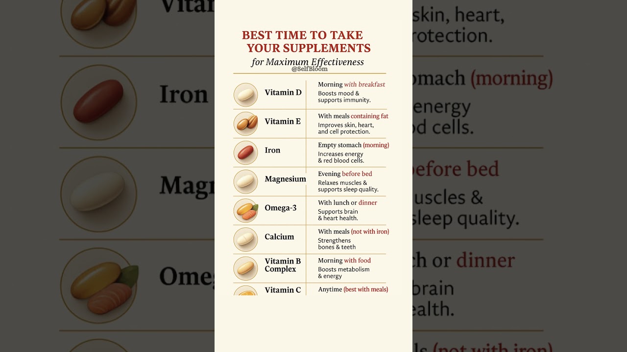 best time to take supplements, vitamin timing guide, when to take vitamins, how to take supplements effectively, supplement absorption, health tips, self bloom health, wellness shorts, natural health, daily vitamins guide, supplement mistakes, nutrition timing, morning supplements, bedtime supplements, vitamin d timing, magnesium at night, holistic wellness, healthy lifestyle, food and nutrition, supplements for women, supplements for men