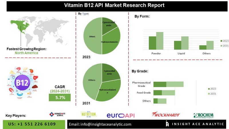 InsightAce Analytic Pvt. Ltd. announces the release of a market assessment report on the “Global Vitamin B12 API Market – (By Type (Cyanocobalamin, Hydroxocobalamin (Hydroxocobalamin Chloride, Hydroxocobalamin Acetate, Hydroxocobalamin Base), Others (Methylcobalamin, etc.)), By Form (Powder, Liquid), By Grade (Pharmaceutical Grade, Food Grade, Industrial Grade), By Distribution Channel (Direct Sales, Distributors/Wholesalers, Online Retailers, Pharmacies, Others)), Trends, Industry Competition Analysis, Revenue and Forecast To 2031.”
