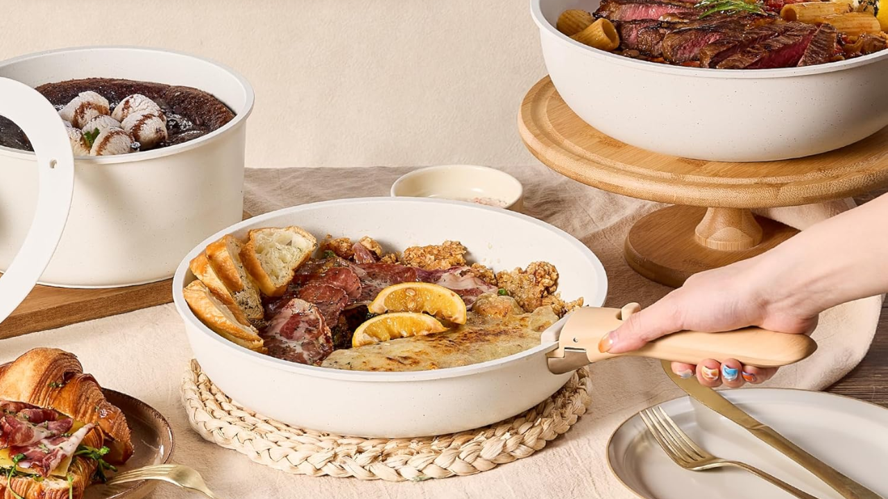 16-piece set including pans, Dutch oven, lids and magnetic storage racksNon-toxic ceramic coating without PTFE, PFOA, PFAS, lead or cadmium according to the companyCompatible with induction, gas and electricOven safe to 550 degreesIncludes canvas lid holder and modular magnetic organization system