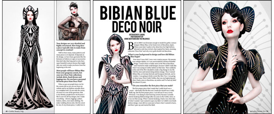 Bibian Blue‘s Bibiana Berenguer really exemplifies some of Gothic Beauty Magazine‘s core values. A pioneer of goth couture, she came out of the European gothic scene, sought out education at the Barcelona International Academy of Fashion, and created work which was truly original, blending influences both modern and old. Growing up, she was exposed to antique restoration and jewelry design at a young age. Eventually she ran a gothic clothing store but wanted clothing items to exist which did not exist yet. Bibian Blue initially launched via goth festivals like Mera Luna and Wave Gotik Treffen. Her first signature piece, a corset, is still her dream garment. For the first decade, Bibian Blue produced ready-to-wear designs, but today all her Barcelona-based atelier’s creations are made-to-measure custom apparel. Bibiana says that, as she herself has matured, she does not want to rush and enjoys her shift to slow fashion and especially made-to-order bridal outfits. Some of her most intricate couture dresses can take an entire week to complete. Her unconventional wearable art designs incorporate historical craftsmanship, structured corsets, filigree detailing, lavish materials, and unique takes combining gothic sensibilities, fantasy, and elegance.