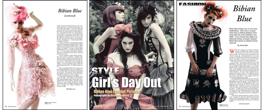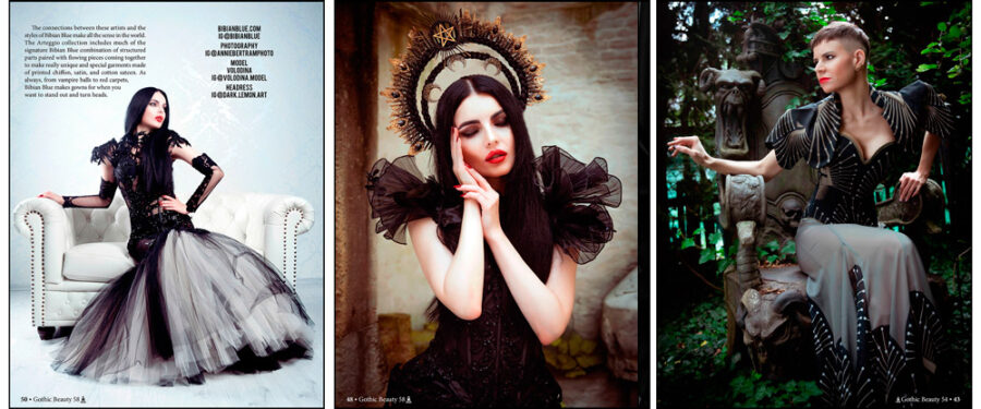 Her work has been covered directly many times in Gothic Beauty Magazine, including Gothic Beauty Magazine 30, 33, 54, and 58, and has also appeared in numerous photographs at balls and festivals and similar. Gothic Beauty has published her collaborations with some really excellent alternative fashion photographers including Annie Bertram, Monica Chamorro, Alan Amato, Phantom Orchid, and The Wild Rose. Models who have worn her exquisite designs in Gothic Beauty Magazine’s pages include Ulorin Vex, Morrigan Hel, Volodina, DarkMoon, Danae Cuesta, Marta, The Wild Rose, Denise del Conte, and more. Her gowns graced the covers of Gothic Beauty Magazine 30 and 54.