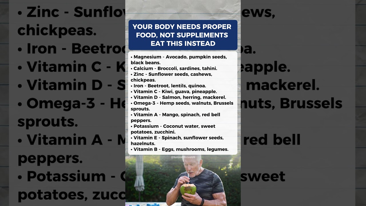 If you’re over 60, you don’t need pills to get your nutrients — real foods can do the job better. In this video, you’ll learn the best whole foods for magnesium, calcium, zinc, iron, Vitamins C, D, A, E, the B-complex, omega-3s, and potassium. These natural foods help support stronger bones, better memory, improved immunity, heart health, and long-lasting energy for seniors.