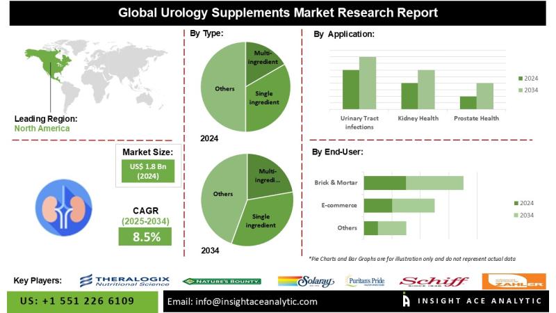 InsightAce Analytic Pvt. Ltd. announces the release of a market assessment report on the “Global Urology Supplements Market- By Type (Multi-ingredient, Single Ingredient), By Application (Urinary Tract Infections, Kidney Health, Prostate Health, Bladder Health and Others), By Formulation (Capsules, Softgels, Tablets, Liquid and Others), By Distribution Channel (Brick & Mortar, E-Commerce)) Trends, Industry Competition Analysis, Revenue and Forecast To 2034.”