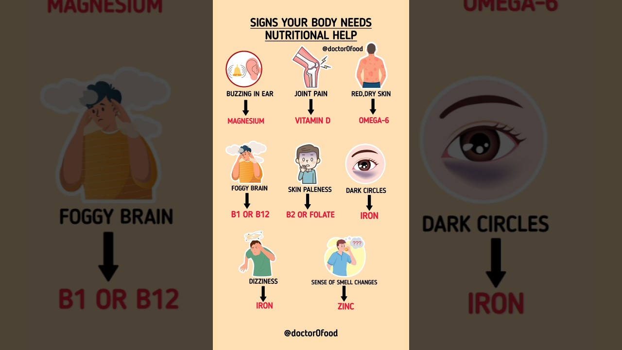 nutritional deficiency symptoms, signs of vitamin deficiency, mineral deficiency signs, magnesium deficiency symptoms, vitamin d deficiency joint pain, omega 6 deficiency skin problems, brain fog vitamin deficiency, b12 deficiency symptoms, folate deficiency signs, riboflavin deficiency, iron deficiency anemia symptoms, dark circles iron deficiency, dizziness low iron, zinc deficiency loss of smell, nutrition health tips, balanced diet importance, hidden nutrient deficiencies, dietitian nutrition advice, vitamin and mineral imbalance, food based nutrition, health awareness content