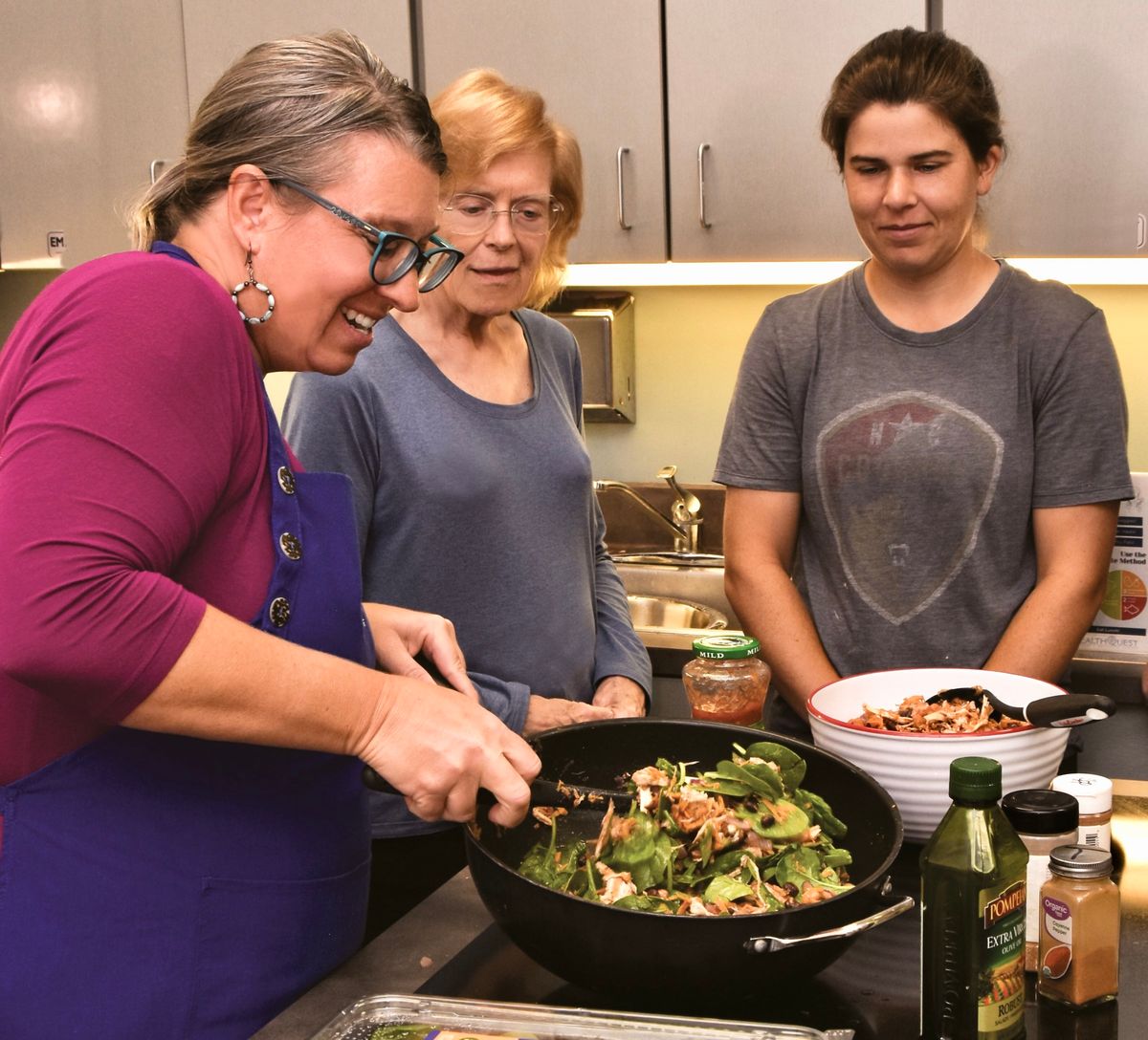 Terri Chapman also hosts monthly “eat with me” sessions in the HealthQuest teaching kitchen. Recently, she prepared chicken and vegetable burritos while participants watched, asked questions, and later served themselves. The $15 class emphasizes simple recipes and practical tips.