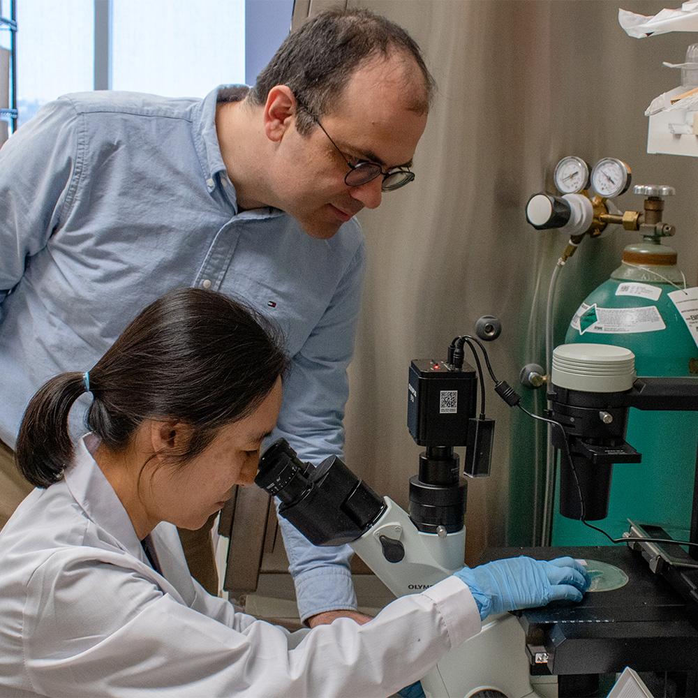 Michalis Agathocleous, Ph.D., Assistant Professor in CRI and of Pediatrics, works with Ji Hyung Jun, Ph.D., Agathocleous Lab Senior Research Scientist at UT Southwestern.