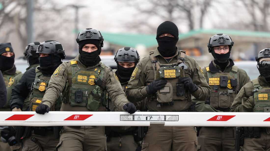 US Border Patrol agents stand guard at the Bishop Henry Whipple Federal Building in Minneapolis, Minnesota, on January 8, 2026. A US Immigration and Customs Enforcement (ICE) agent shot and killed an American woman on the streets of Minneapolis on January 7, leading to huge protests and outrage from local leaders.