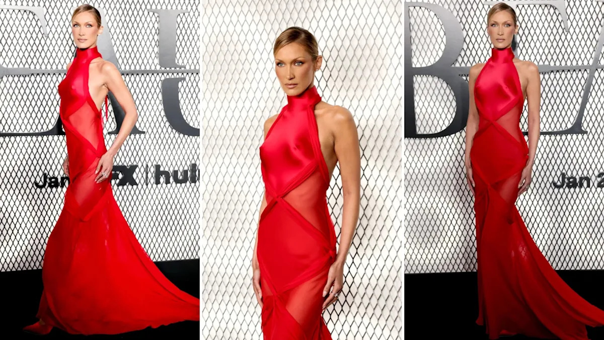 Bella Hadid opts for a sleek red halter gown with sheer detailing while attending FX’s “The Beauty” premiere in New York City.