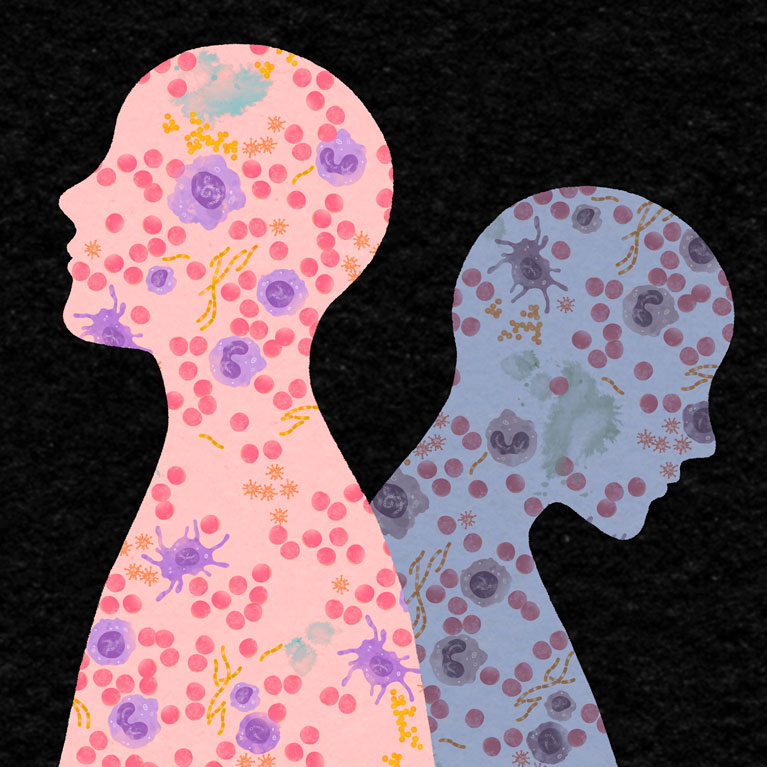 Salk scientists discover that different people can have distinct responses to the same infection depending on how their genetics and life experiences have shaped their immune cell function. The colorful left silhouette represents a patient whose immune system is well-suited for the same infection that the dull right silhouette is unable to handle.