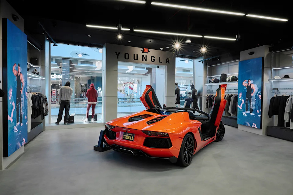 Fitness and lifestyle label YoungLA has opened its first flagship at Westfield Topanga mall, translating its digital-native roots into a physical format. The store has a high-energy feel, featuring a Lamborghini installation and digital screens throughout the space.