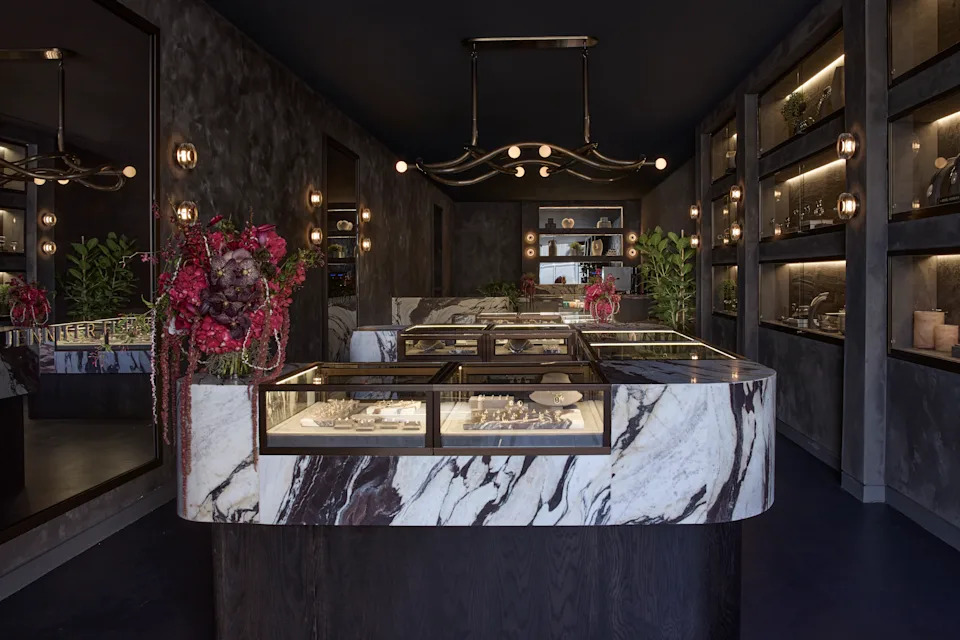 Relocating from Cannon Drive, the 1,281-square-foot space — designed with longtime collaborator Michelle Gerson — introduces rich woods, metals and marble, layered with banquette seating and a small in-store café bar. Cozy and inviting, the store spotlights her signature hoops and bold fine jewelry.