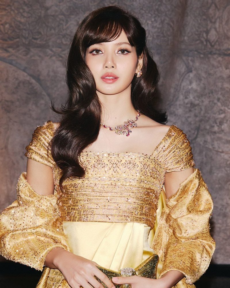 This piecey hairdo with silky, cascading waves makes for Lisa’s girl-next-door turn at the Amazing Thailand event. When paired to her feathery brows and the softer, diffused pigments around her eyes—but note the strong liner and mascara delivery still—we can’t help but see her shift into her role as the nation’s princess.