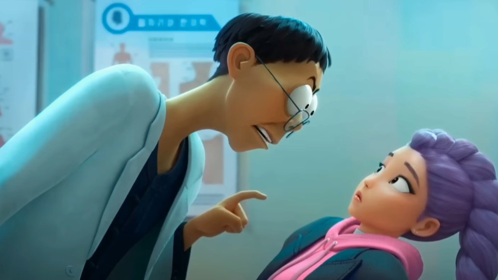 That man happens to be a character named Healer Han. However, instead of examining Rumi’s throat directly, he tries to examine her in a more “holistic” manner — by staring menacingly into her face, and then also right into her friends’ faces. “In order to heal a part, we must understand the whole”, he claims.
