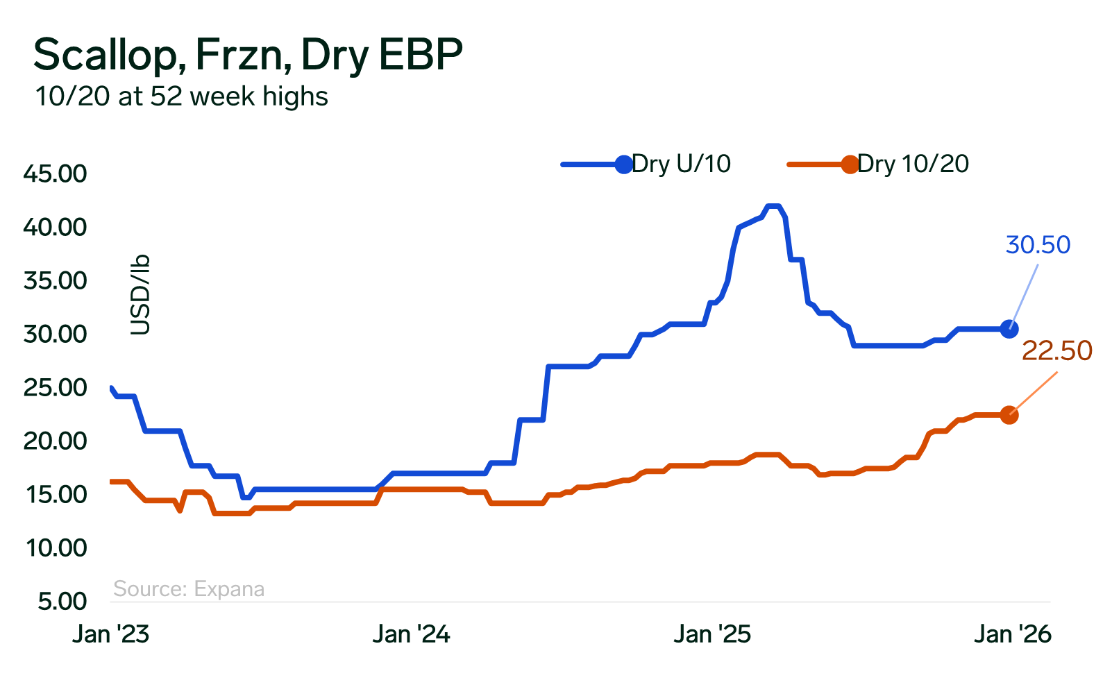 Despite these developments, domestic scallop prices across categories continue at elevated levels, with U/10s remaining significantly above historical averages and 10/20s tracking…