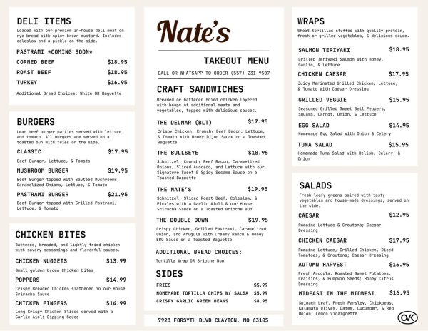 Nate’s is accepting orders by phone or WhatsApp at 557-231-9507. The menu includes burgers, chicken bites, sandwiches, wraps and salads, all certified kosher by the Vaad Hoeir of St. Louis.