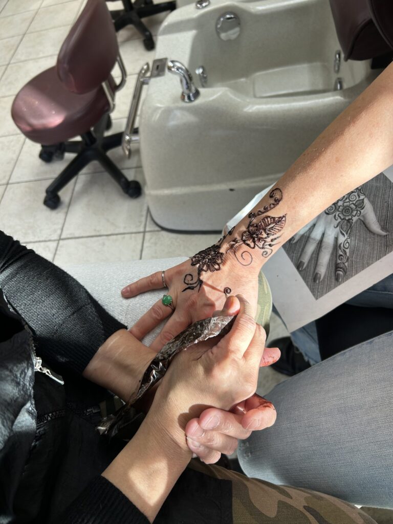 Fatima is creating a henna work of art on my hand in between clients. I’ve been going to her salon since our boys were in middle school.