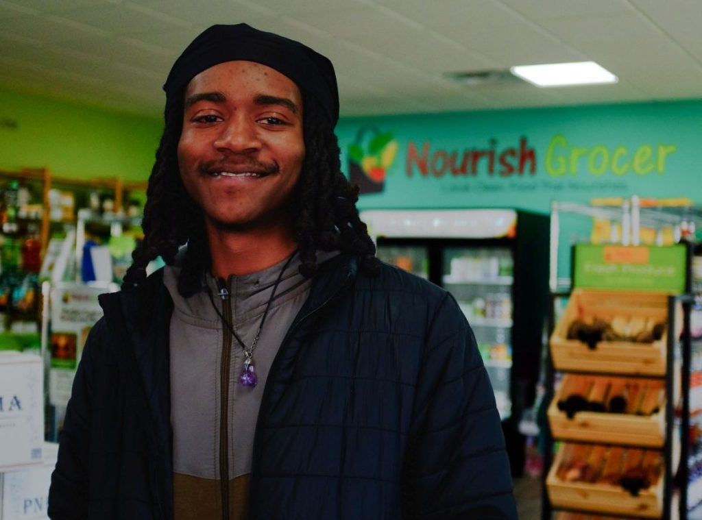 Miles College student Antonio Smith, who works for Nourish and is a vegan, said buying groceries used to mean multiple trips to distant stores for him. (Photo by Forrest Terrell)