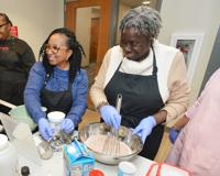 Cassandra Broadway, center, and Regina Robinson prepare muffins during a culinary class designed help people learn how to manage hypertension through the food they eat. The class was held Jan. 29 at Corewell Health Center for Wellness in downtown Benton Harbor.