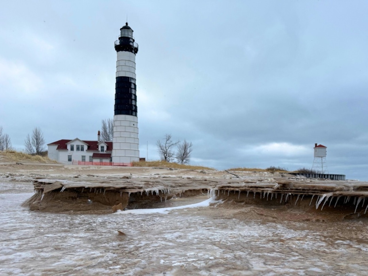 The live view from the lighthouse’s lantern room webcam shows its currently surrounded by frozen sand, patches of wind-blown sand, and a small Lake Michigan ice shelf.