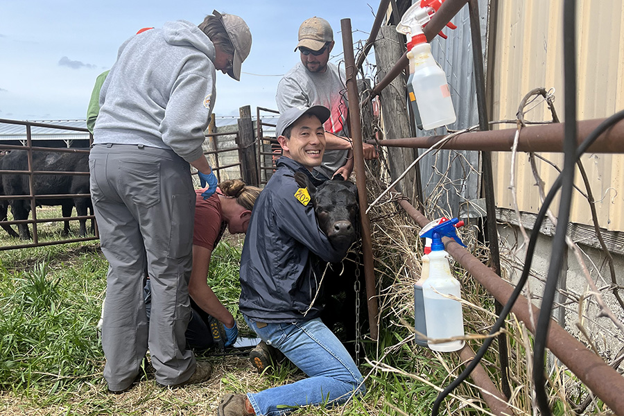 Shoki Hirano holds a calf steady while a team of fellow researchers evaluates it. Hirano has been working on a project to evaluate the effectiveness of vitamin B supplements in preventing illness in cattle.