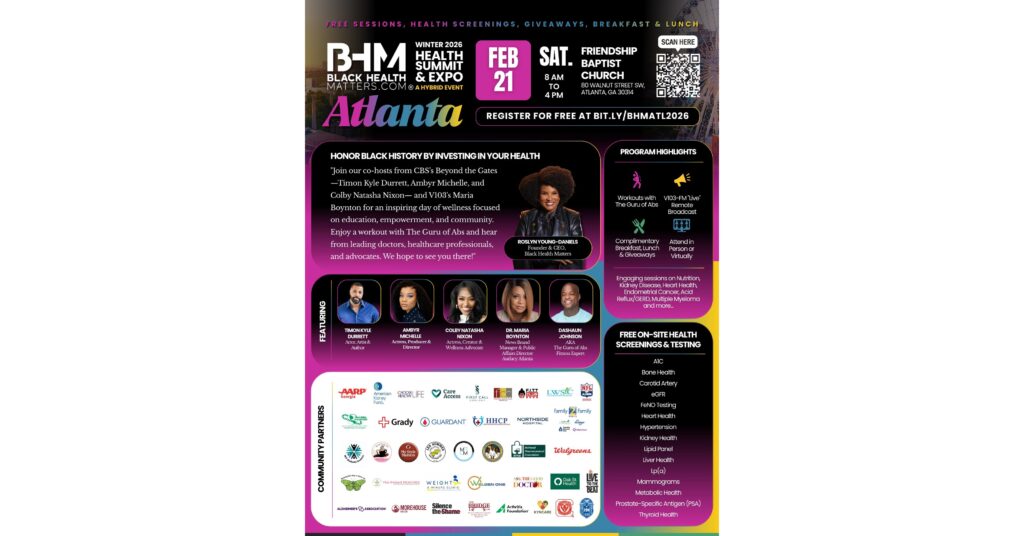 ATLANTA, Feb. 11, 2026 /PRNewswire/ — Black Health Matters (BHM), the nation’s leading health and wellness platform for Black and Brown communities, will host its Winter 2026 Health Summit & Expo on Saturday, February 21, from 8:00 a.m. to 4:00 p.m. at Friendship Baptist Church, located at 80 Walnut St. SW, Atlanta, GA 30314. The free, day-long event is designed to provide culturally relevant health information and community-based resources that empower individuals to take control of their health. The summit will feature expert-led panel discussions, interactive wellness activities, free onsite health screenings, complimentary breakfast and lunch, and wellness giveaways.
