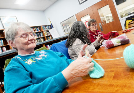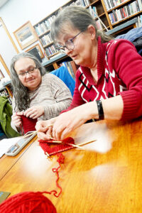 Barb Tessin (right) of Hollidaysburg shows the progress at knitting a hat with Kathy Wolf (center) of Altoona at the Hollidaysburg Area Public Library on Wednesday afternoon.