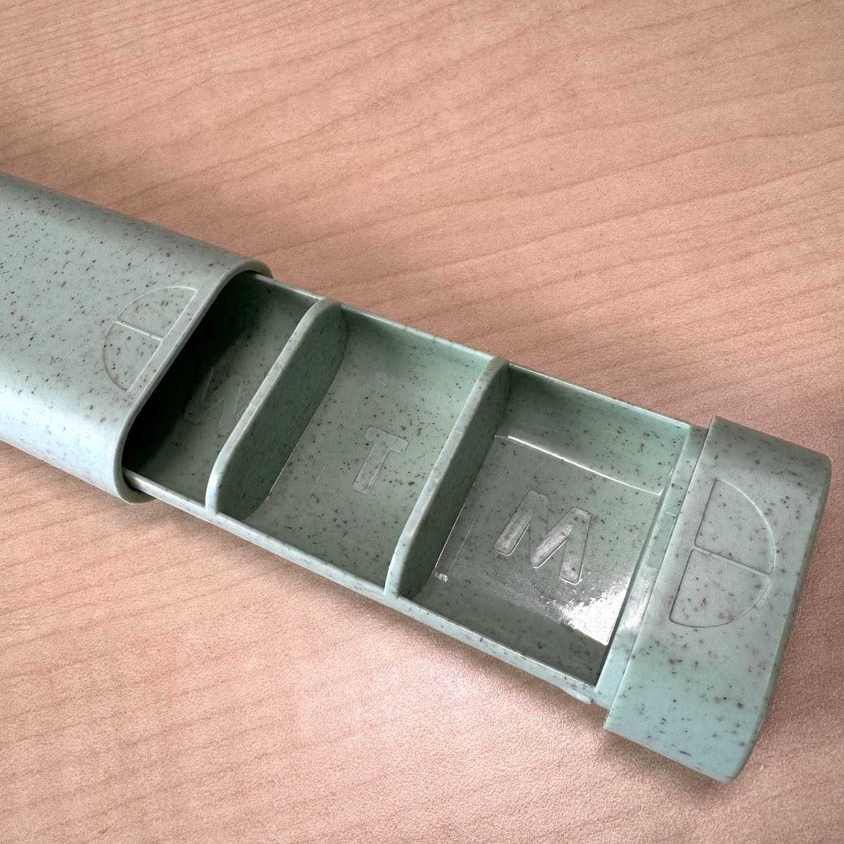 You’ll pull it open to reveal the pill compartments. Each one is labeled with a letter for the day of the week, starting with “M” for Monday. I believe the intent here is enable you to load up your pills and supplements, then you can slide to the next day to unload your items without tipping out all of the contents.