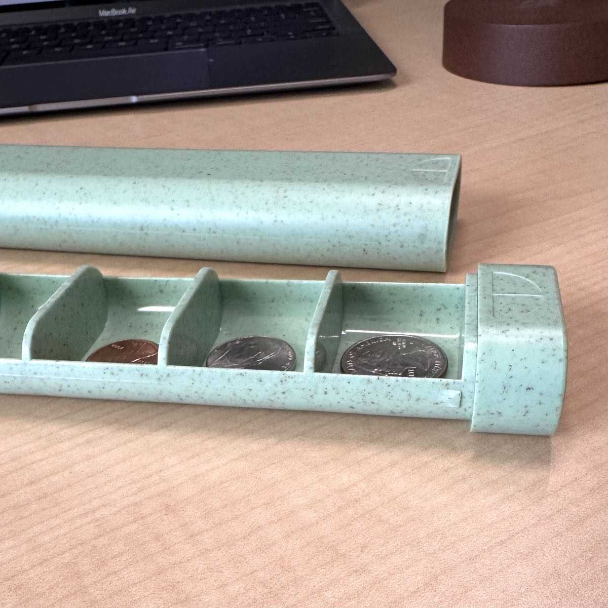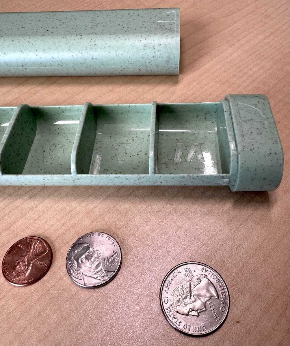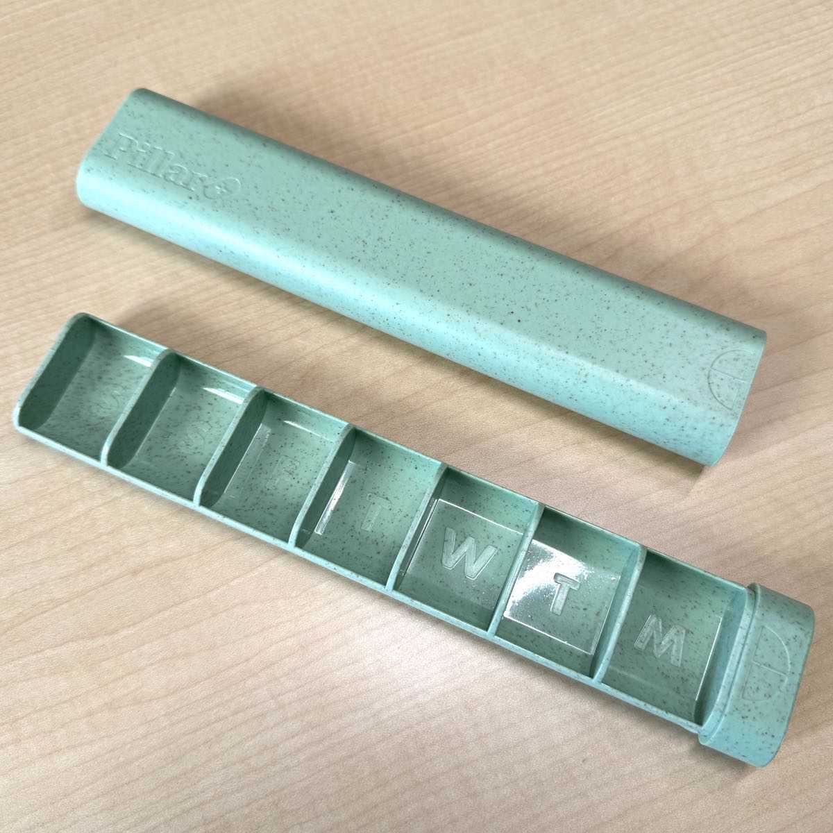 It’s a 7-day pill organizer that is made from recycled/sustainable materials with wide, deep compartments for larger pills and tablets.