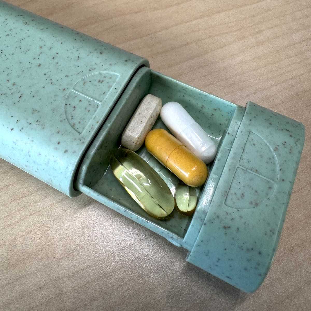 To give you a sense for capacity I’ve loaded a series of larger supplements below. On the far left you’ll find pretty standard multivitamins, followed by magnesium powder caps and larger Omega-3 gel caps. I can get about 10 vitamins, 8 caps, and 7 gel caps in these chambers without impeding performance.