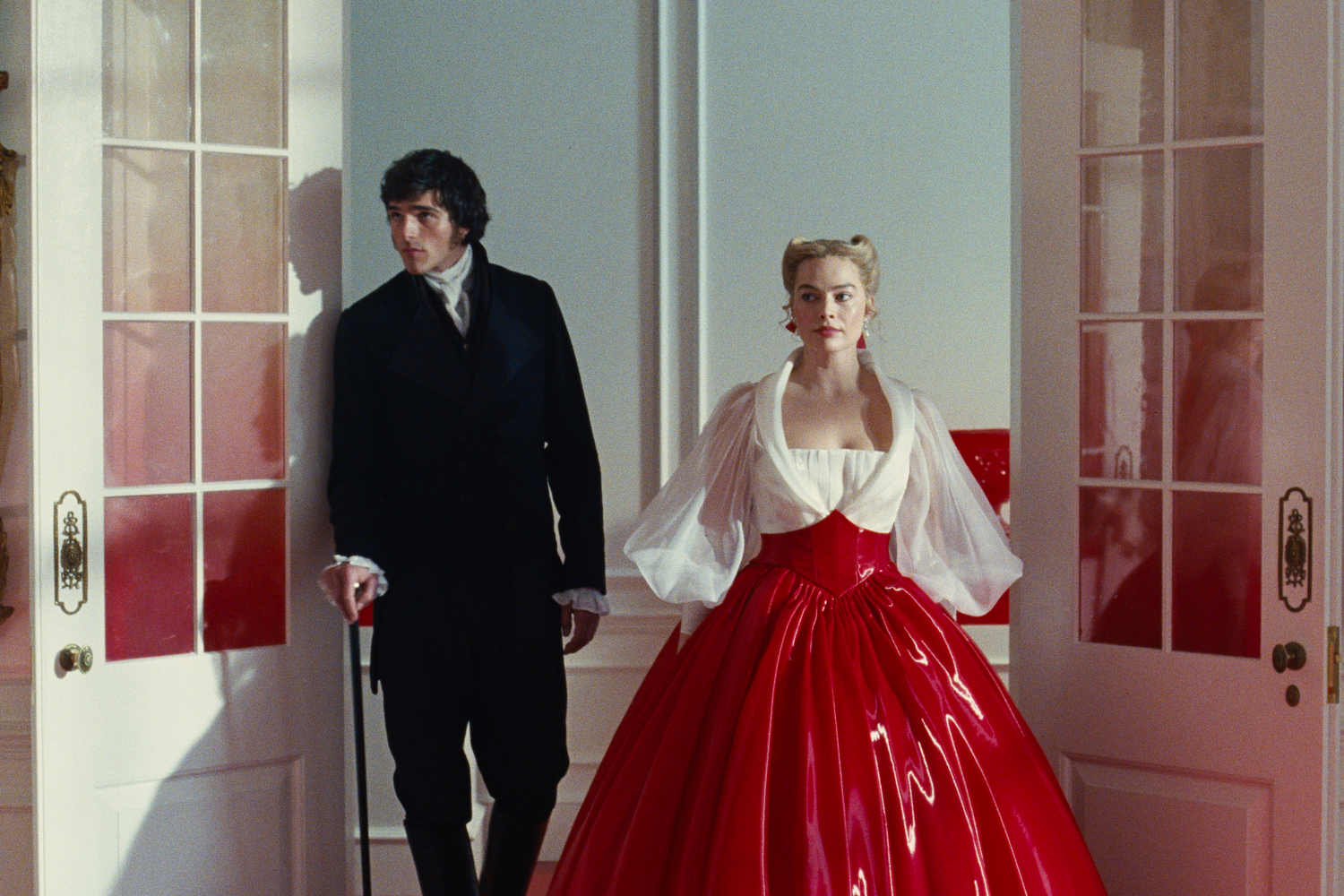 Love as domination is a thread through the film, and Cathy’s corset hair—two plaits cascading to her waist, woven in a corset-like lattice of crimson ribbon—illustrates it perfectly. At first glance, the style may seem like a sexy wink—but here, it’s Cathy’s new housemate, Isabella, asserting control, styling Cathy like a doll as she becomes ensnared in her new life at the Grange. Innocent dress-up gradually takes on a more sinister edge. “She’s like, ‘I’ve made a doll’s house. I’ve created this style, and now I’m going to replicate this on you,’” says Miller. “And you just think, Goodness me, that’s actually a little bit eerie.”