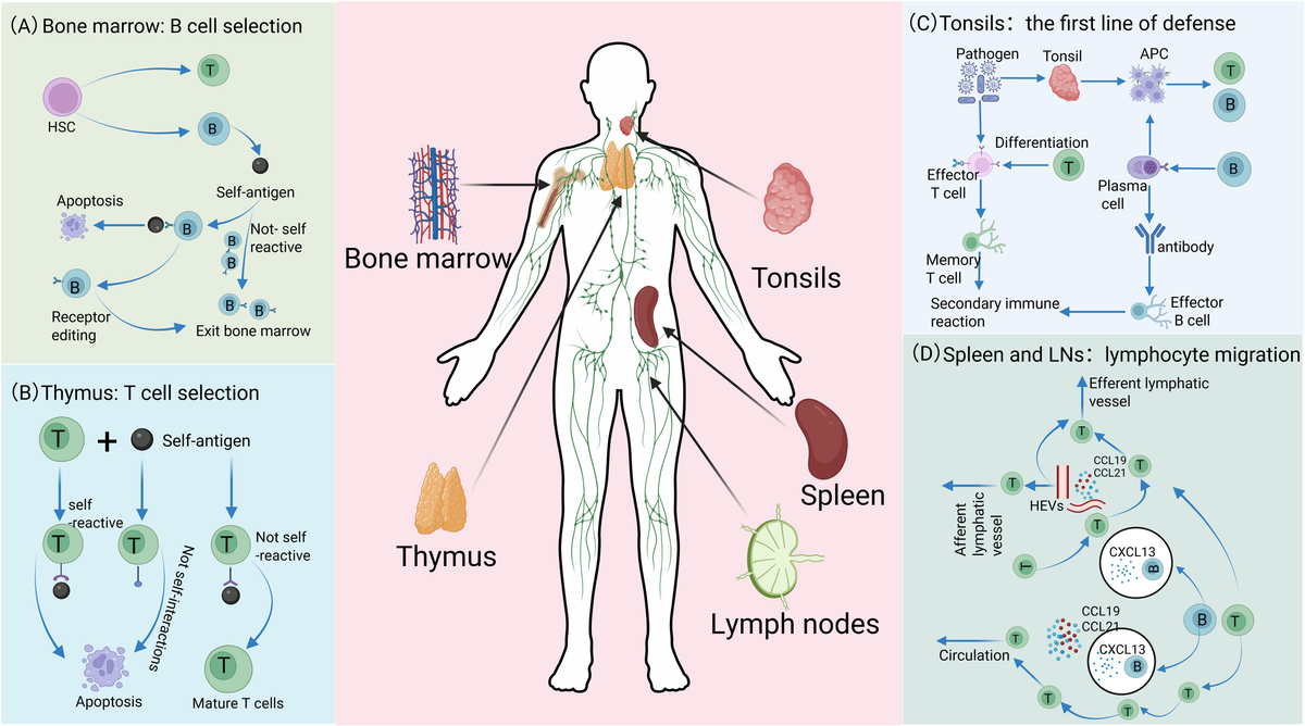 Distinct roles of immune organs in cellular development. (A) In the bone marrow, lymphocytes originate from HSCs. Among these, the majority of B cells matures and migrates to SLOs, while a small subset exhibiting high self-antigen affinity is eliminated through clonal deletion or receptor editing, thereby ensuring the maintenance of autoimmune tolerance. (B) After T cell precursors are generated in the bone marrow, they migrate to the thymus for maturation and selection. T cells with strong self-antigen binding or ineffective interaction with self-molecules are eliminated, whereas non-self-reactive precursors successfully mature and differentiate into functional T cells. (C) The tonsil serves as the first line of defense, capturing pathogens. Its APCs process antigens and activate T and B cells, promoting T cell differentiation into effector and memory T cells, and B cell differentiation into plasma and memory B cells. Plasma cells secrete antibodies, effector T cells eliminate pathogens, and memory cells establish immune memory to enable robust secondary responses. (D) Lymphocytes enter SLOs through distinct migration mechanisms and achieve region-specific localization. In the spleen, lymphocytes access the white pulp via MZ, with migration precisely regulated by chemokine receptor signaling: B cells migrate to follicles guided by CXCL13, while T cells are recruited to T cell zones in response to CCL19 and CCL21. Although the mechanisms of lymphocyte egress from the white pulp remain incompletely understood, this process is critical for maintaining systemic immune homeostasis. In LNs, lymphocytes primarily enter through HEVs rather than afferent lymphatic vessels. Guided by CXCL13, CCL19, and CCL21, they home to B cell follicles or T cell zones, respectively, and eventually exit via efferent lymphatics to re-enter systemic circulation.