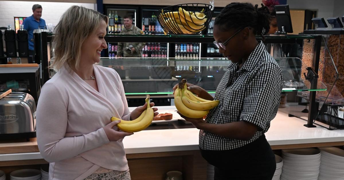 Katie Breazeale, 42 Bistro dietitian, Compass Group USA, Inc., greets Ania Thurmand, cashier, 42 Bistro, Compass Group USA, Inc., Feb. 12 while Thurmand places bananas out for patrons at 42 Bistro at Fort Hood.