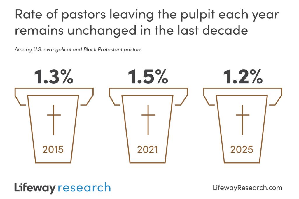 Only around 1 in 100 pastors leave the ministry each year, according to a Lifeway Research study of evangelical and Black Protestant pastors. The percentage of pastors who leave for reasons other than retirement or death has remained statistically unchanged over the past decade: 1.3% in 2015, 1.5% in 2021 and 1.2% in 2025.