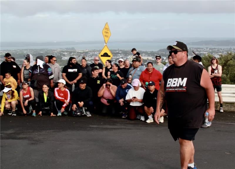 James McDiarmid at the top of Mt Eden maunga with fitness participants from BBM. Photo / Supplied