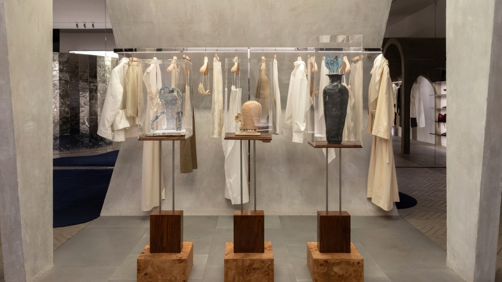 Carven invited French artist Juliette Teste, cofounder of ARC studio, to display in the space and she reinterpreted the brand’s aesthetic codes through her sculptural vessels. Her vase-drawings, inspired by ancient frescoes and pop culture, echo the brand’s signature Esperanto line. The spring 2026 collection features whites, blacks, grays and ecru, blending sportswear with sophisticated fabrics like lace, lingerie and silk.