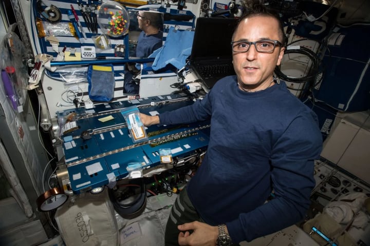 NASA astronaut Joe Acaba stores a vial of saliva on the space station. His and other saliva samples are sent back to Earth, where scientists analyze them to track changes in the immune system of crews during spaceflight.